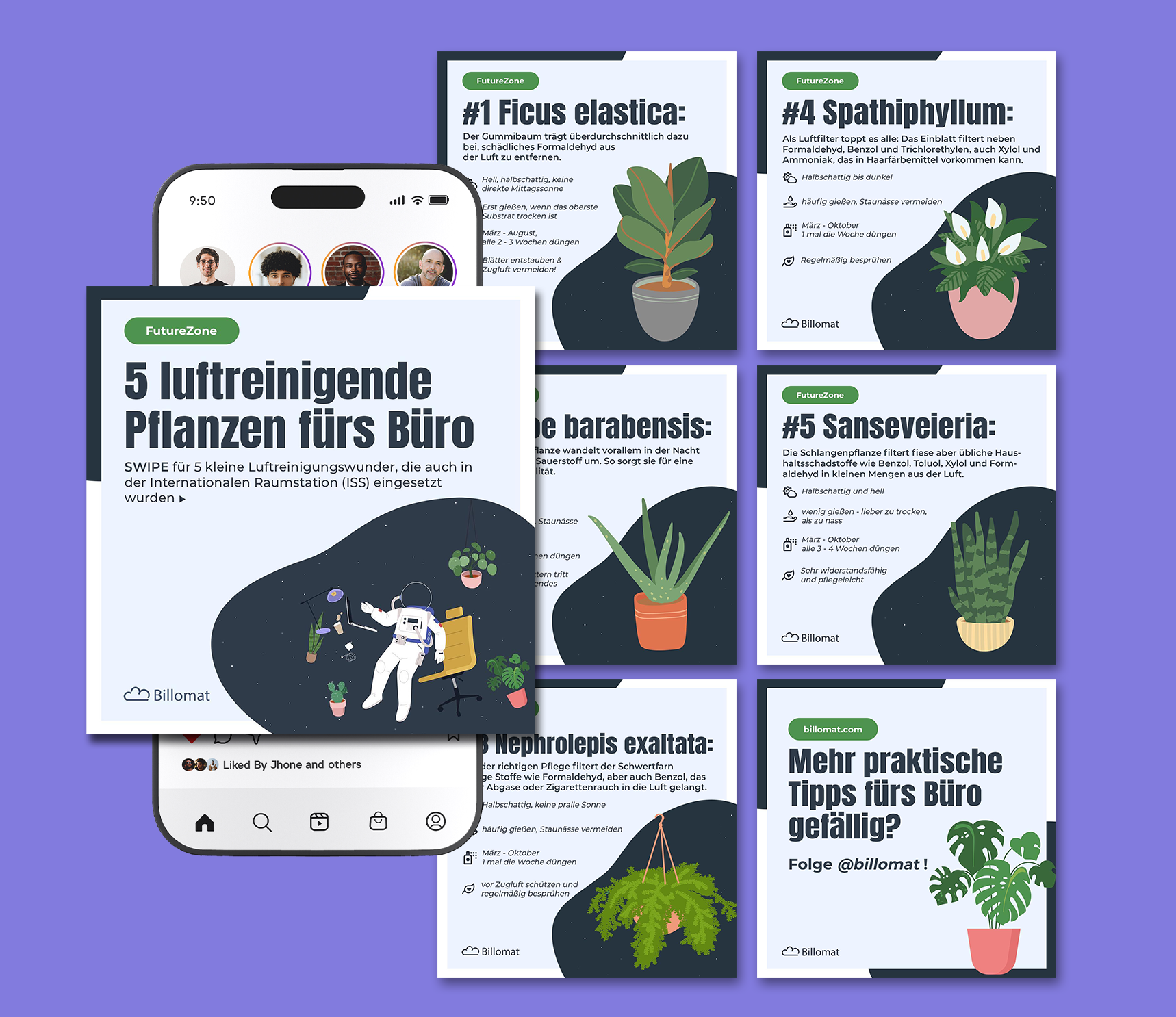 Concept and setup of organic social media / Instagram account of a SAAS accounting solution, including content creation. To achieve reach and awareness, the software should be marketed as a lifestyle brand. The target group was entrepreneurs, freelancers and medium-sized businesses, i.e. groups that could have become potential customers via a suitable customer journey. The starting point for this was the content of the company's own online magazine. Another goal was to increase the number of post interactions and followers.
